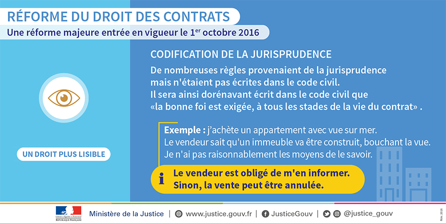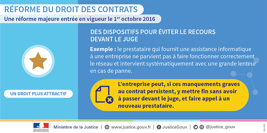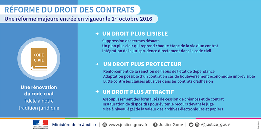 Les objectifs de la réforme : un droit plus efficace, plus clair et plus protecteurCette réforme d’ampleur répond aux besoins pratiques des particuliers et des entreprises et s’articule autour de trois objectifs : simplicité, efficacité et protection. L’ordonnance remplace les textes en vigueur par un dispositif rédigé dans un style modernisé, mais toujours aussi concis et précis, et agencé selon un plan chronologique et pédagogique. Chacun peut désormais, à la lecture du code, appréhender l’ensemble des étapes de la vie d’un contrat, de sa formation à son exécution. Sur le fond, le texte consacre et codifie de nombreuses avancées conçues par la jurisprudence, rendant le droit plus accessible et prévisible. De nouvelles règles, très diverses, sont aussi introduites. Un souci d’efficacité et de rapidité a ainsi conduit favoriser les règlements à l’amiable pour éviter un recours trop systématique au contentieux. La loi permet ainsi désormais de mettre fin unilatéralement à un contrat inexécuté, ou d’accepter une prestation imparfaitement exécutée en échange d’une réduction du prix. L’ordonnance renforce le principe selon lequel une copie fiable, réalisée sur support électronique, a la même force de preuve que l’original. Cela permet de renforcer le poids et la valeur des archives numériques par rapport aux archives papiers. On trouvera de même des dispositions permettant de réduire les incertitudes qui peuvent survenir dans la vie d’un contrat. L’ordonnance instaure des actions dites interrogatoires, qui permettront à un contractant d’interpeller son partenaire afin qu’il ne fasse pas planer, indéfiniment la menace d’annulation du contrat à raison d’un vice intervenu lors de sa formation.
