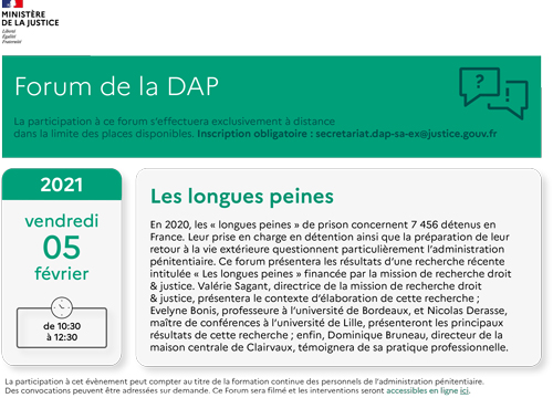 Le laboratoire de recherche et d’innovation de la DAP (EX4) organise le 5 février 2021, de 10 heures 30 à 12 heures 30, une séance du Forum de la DAP intitulée « Les longues peines »