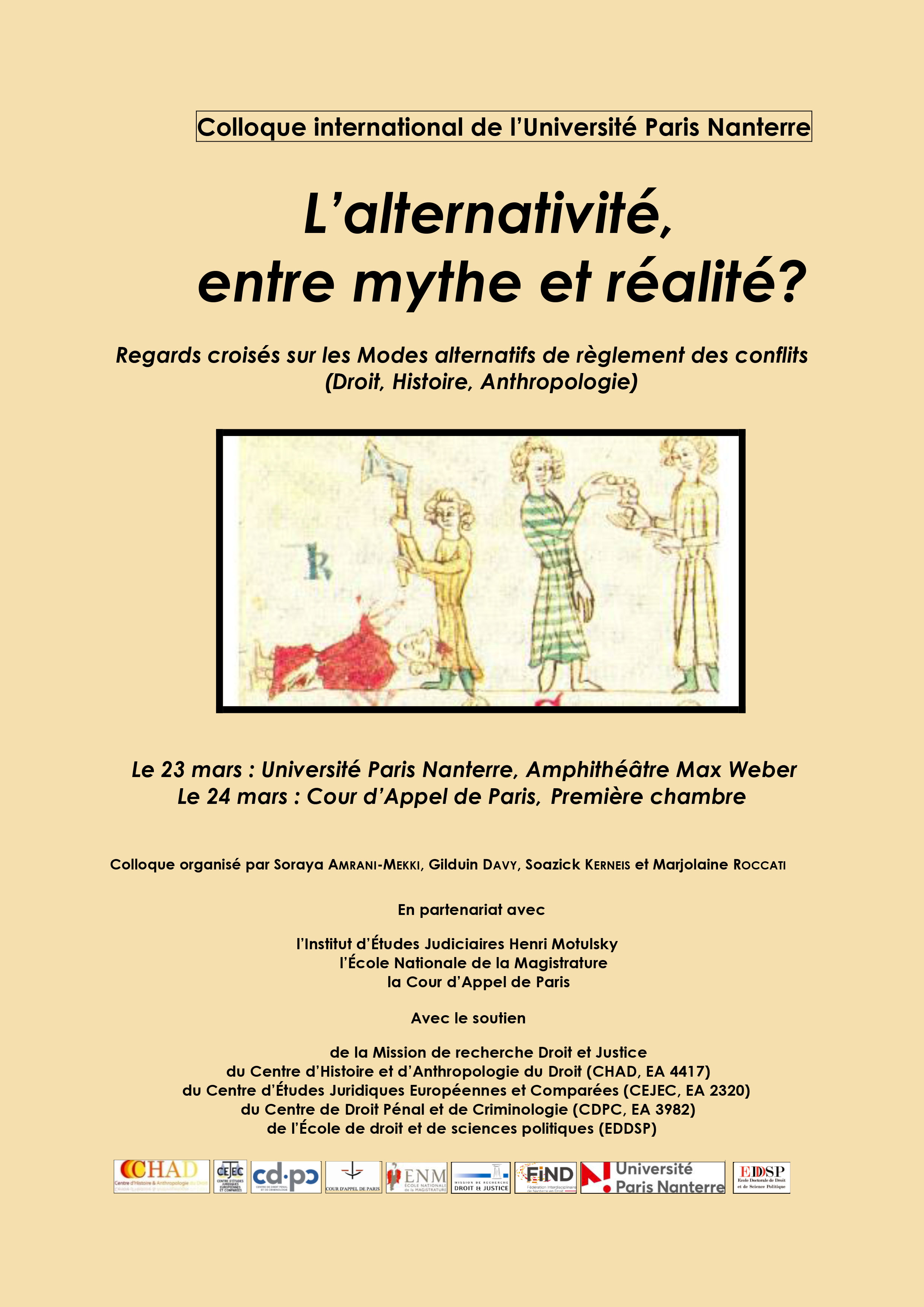 Il est organisé par le CHAD, le CEJEC et le CDPC et porte un regard interdisciplinaire (Droit, histoire, anthropologie) sur les modes alternatifs de règlement de conflits.